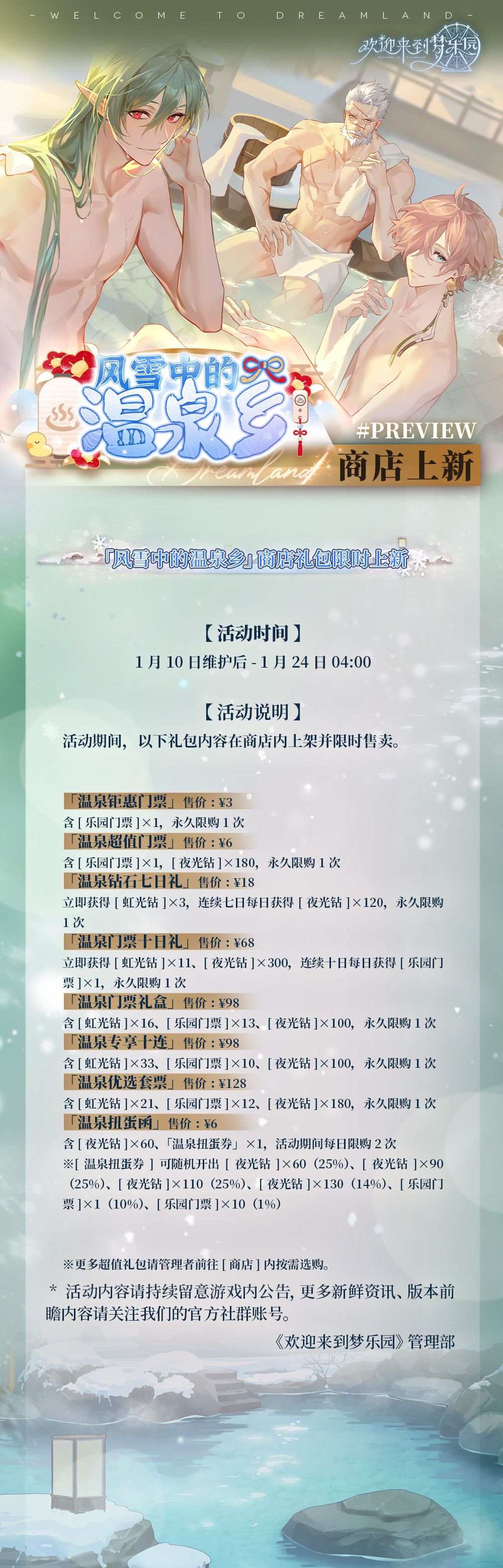 乐园布告栏丨全新限时活动「风雪中的温泉乡」商店礼包·限时上新