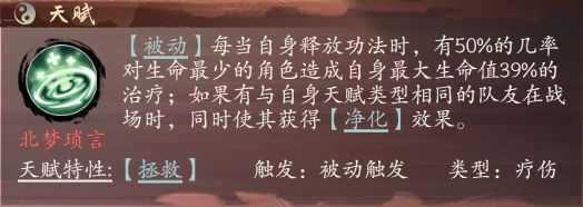 同时,若有与自身天赋类型相同的队友在场,能够使这名队友获得【净化】效果。