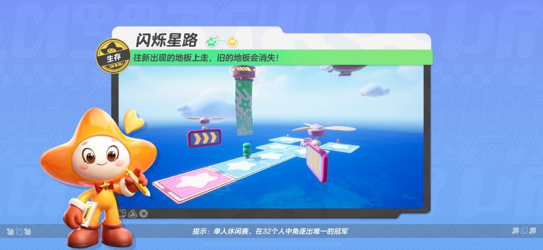 在这张地图里,星宝需要跟随新出现的地板朝前走,躲避各种机关障碍,直至出局玩家数量达标后(8人)即可获得胜利~