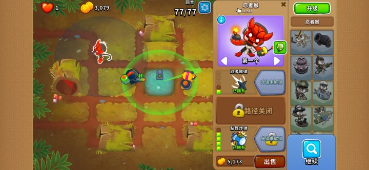 重生迷彩陶瓷海解决后,汽艇是很头疼的事情,因为胶水打汽艇比较慢,尤其是bfb,而且汽艇爆炸生成的也是重生迷彩陶瓷,胶水想击中气球必须要先让潜艇消隐,所以就产生了飞艇把气球运太远而失手的问题。所以我看着所剩无几的经济锁定了一个我非常喜欢的猴子,下路c4忍者。004忍者对飞艇特攻,点一个100增加攻速对付较多的飞艇,可惜我资金不多了,不然我会再增设一个030炼金让飞艇被击破的瞬间再次爆炸。这样一来,答卷就很完美了。