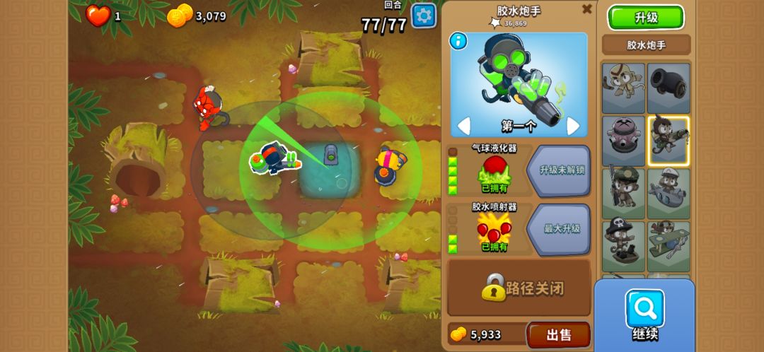 我想到胶水上路克制陶瓷气球,因为陶瓷海,所以需要点中路来应对,但由于资金有限,无法点出无敌的500胶水,420也存在漏气球现象,所以我选择第二个胶水减慢气球逃逸速度。