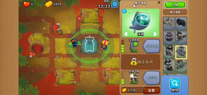 因为没有猴村,所以交给潜艇上反隐。为了省资金,点出潜艇下路增加潜艇攻速来实现无缝消除气球迷彩。