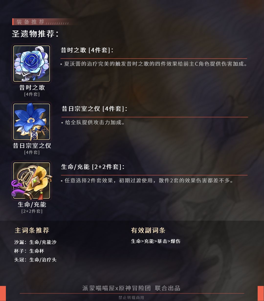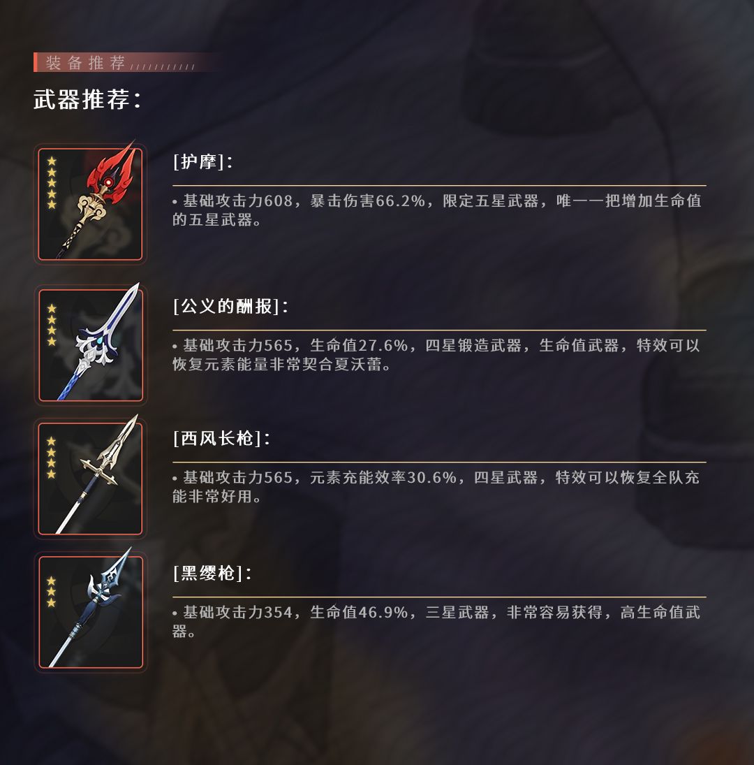夏沃蕾的功能性集中于元素战技上,因此天赋主加元素战技,普攻和大招甚至可以不点。圣遗物和武器主堆生命值,然后是根据队伍适当补充能。