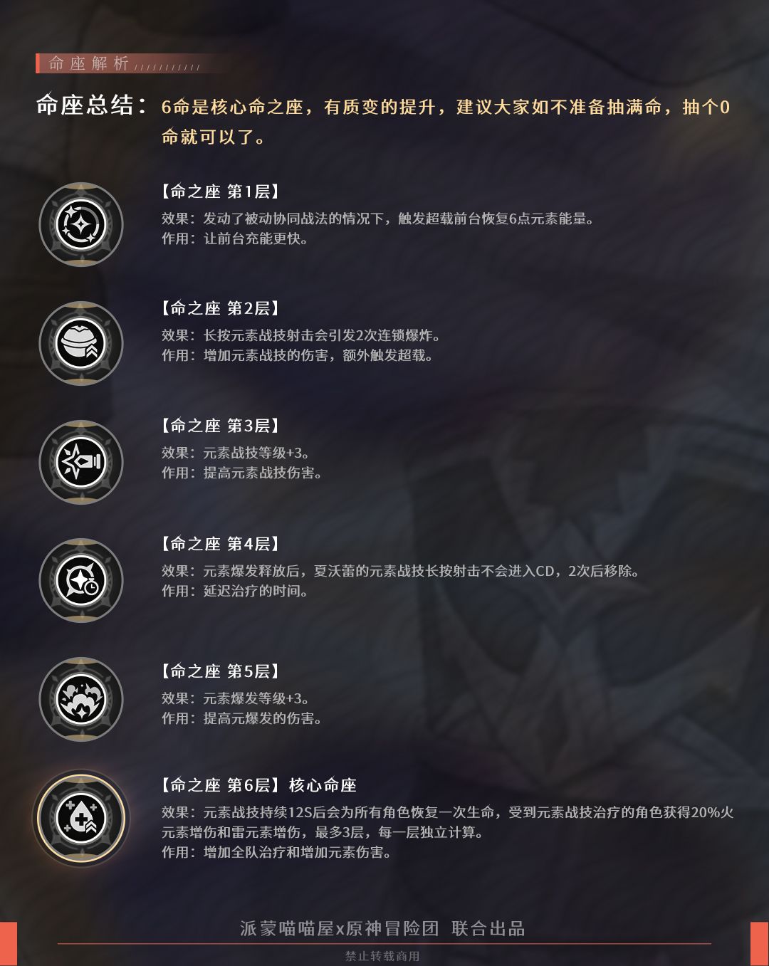 6命是核心命之座,有质变的提升,建议大家如不准备抽满命,抽个0命就可以了。如果大家打算培养超载队,那么夏沃蕾要以6命为目标。不推荐大家在这个池子就把夏沃蕾抽到6命,对超载队感兴趣的玩家可以等新的火/雷主C有消息后,再去补夏沃蕾命座,毕竟4星比较容易抽取。
