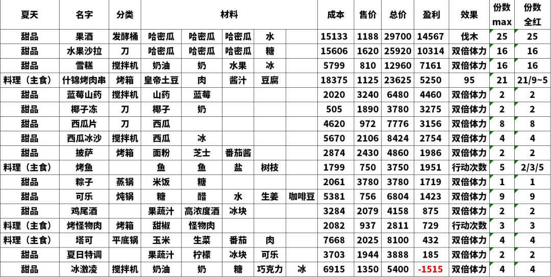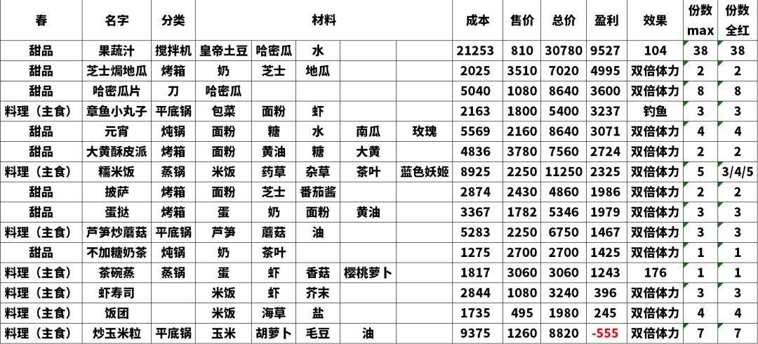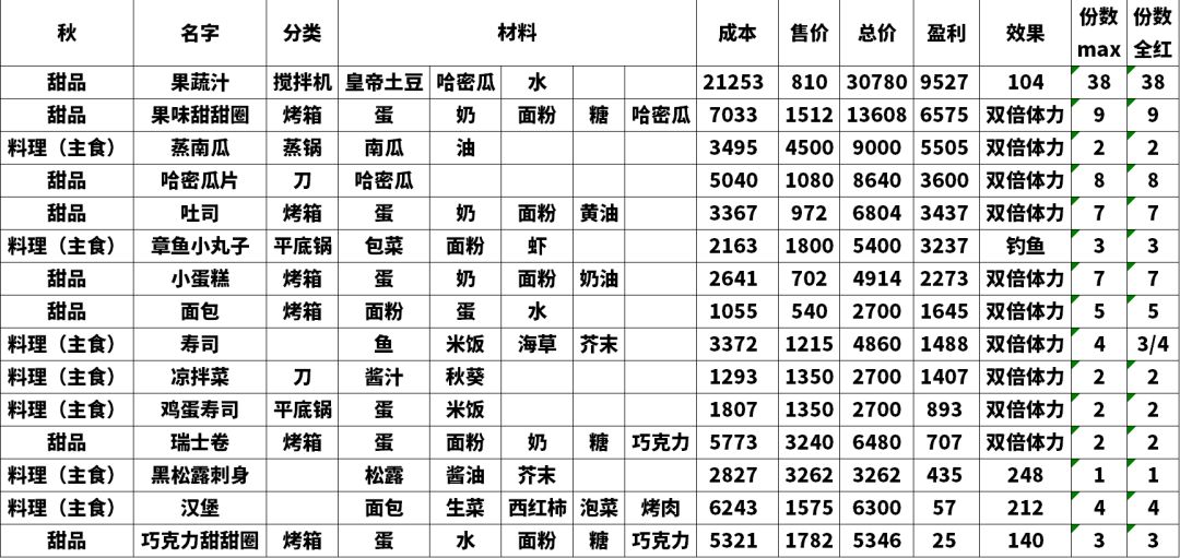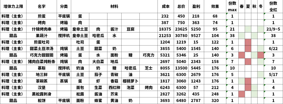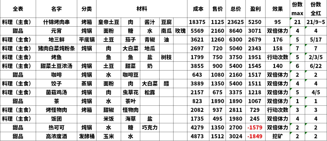 成本核算:植物用的是我上两篇帖子中计算得到的植物最高价格,其他的动物产品是直接用的表显价格,没做处理;料理区存在套娃现象的,用的是【成本】【售价】单价取最高计算