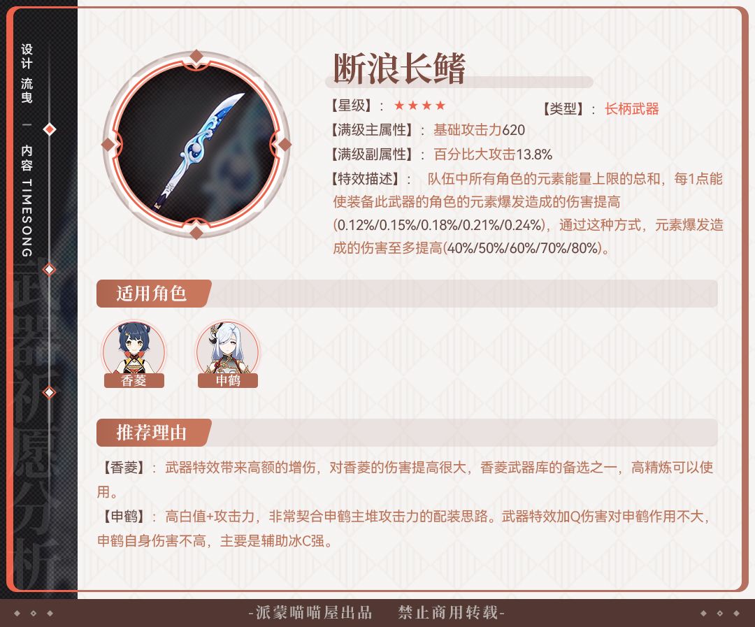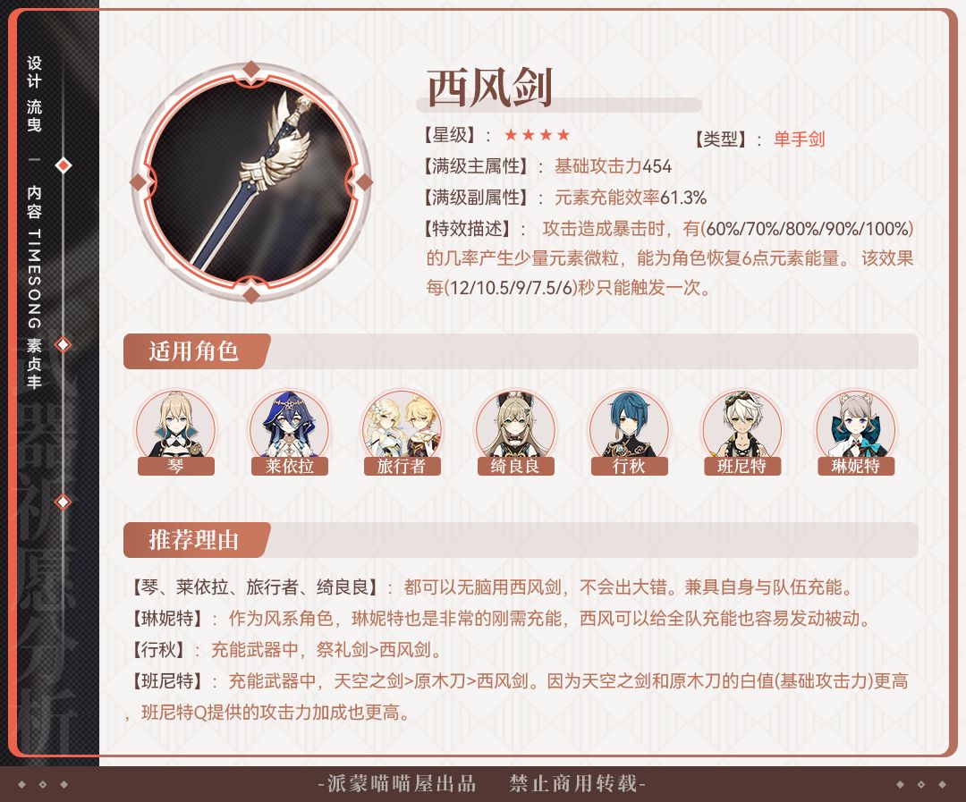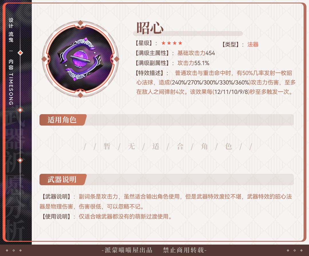 四星武器中,西风剑泛用性很高,许多单手剑角色都需要。弓藏是常驻4星武器,泛用性一般,不过却是宵宫的最佳四星武器,精5弓藏的伤害甚至超过大部分精1五星弓,宵宫玩家没抽到飞雷之弦振可以用弓藏做下位替代。断浪长鳍对于香菱和申鹤是可选武器之一,并没有比其他武器强很多。雨裁适合打绽放反应的双手剑角色使用,比如彩虹雷泽,彩虹多莉等,泛用性比较低,不需要特意抽取。昭心不推荐任何角色使用,完全无用。