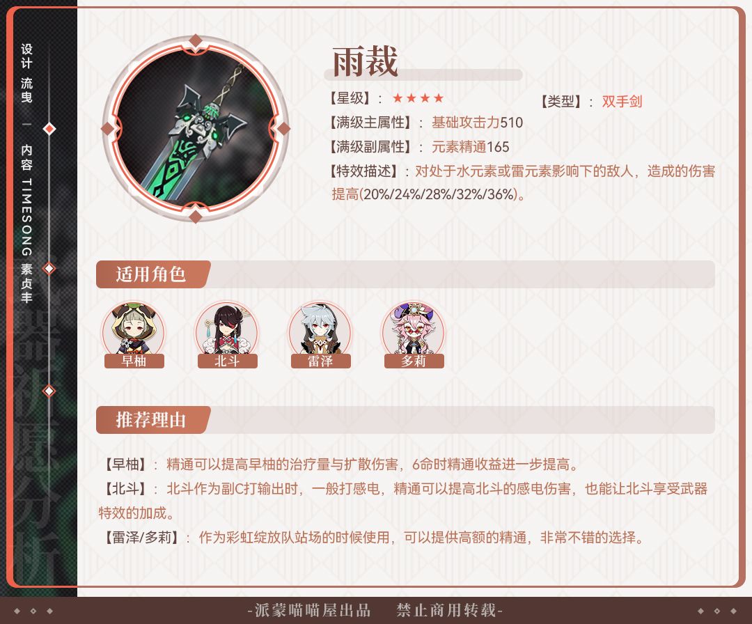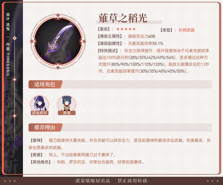 薙草之稻光,在如今版本只有香菱和将军最适用,但是雷神对这把武器的优先级不如2命,所以除非你雷神2命了想进一步提升伤害可抽取,不刚需。