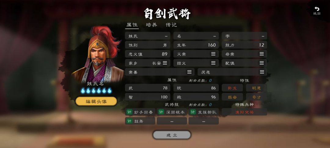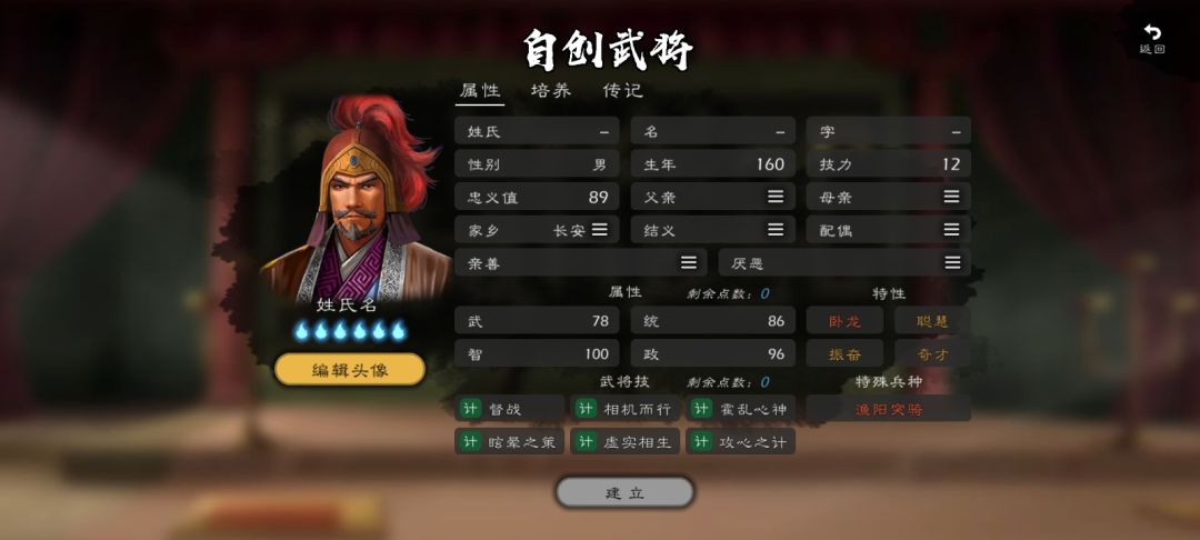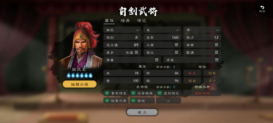 武将属性可以自行调整,天赋先点智力,点出减冷却和消耗的其他的随便点,用渔阳突骑也是因为跑得快,辅助型武将放个技能空档期比较长用轻骑兵会避免被敌人迅速打死