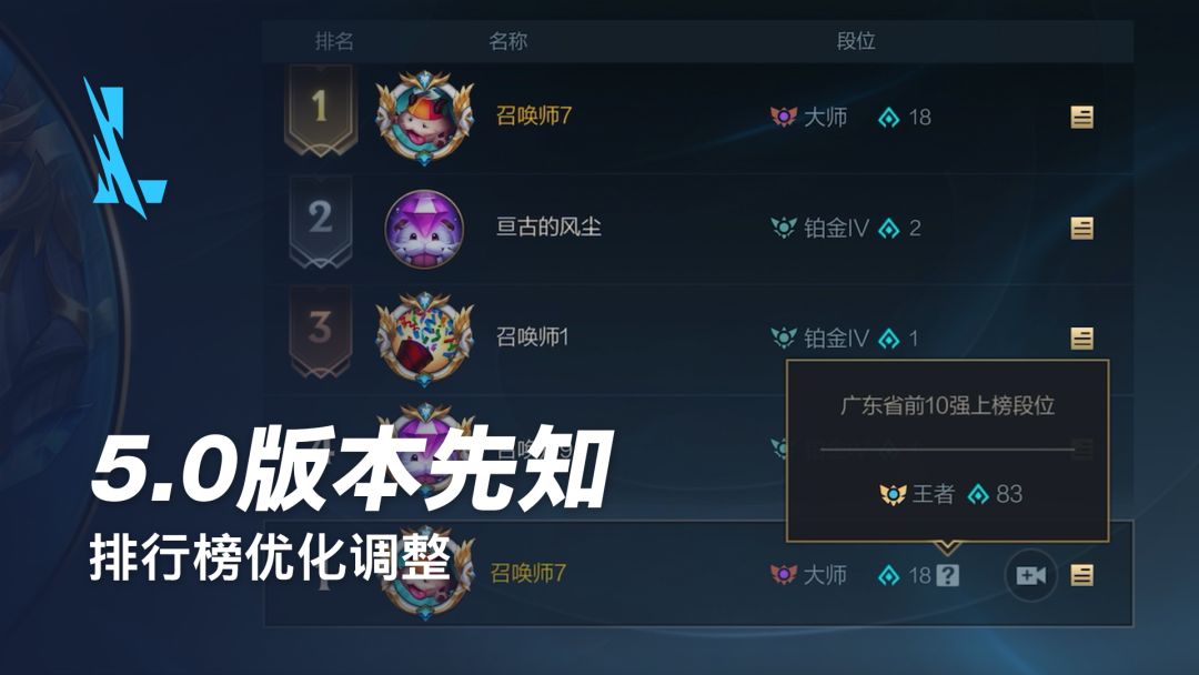 排位赛榜单与峡谷之巅榜单将调整为实时更新,并在每周一发放相应的榜单称号。