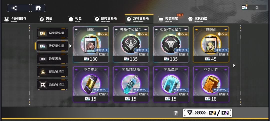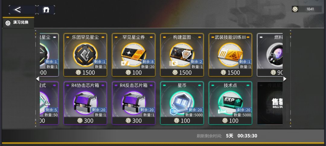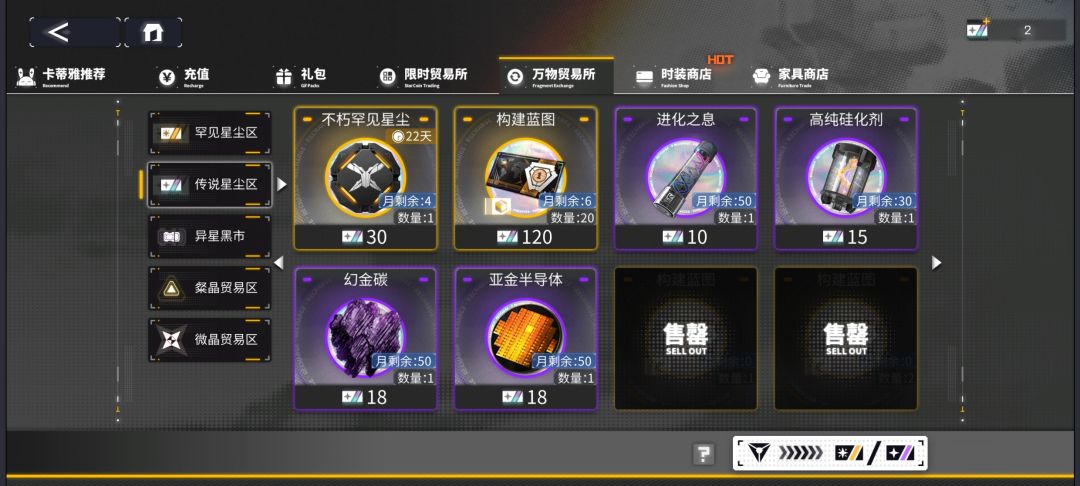 传说星尘卷与燃料、构建蓝图然后换自己需要的传说星尘(有六种)。武装技能训练Ⅲ氪金买竞技次数的可以换(大后期高纯硅化剂有余自己合成)