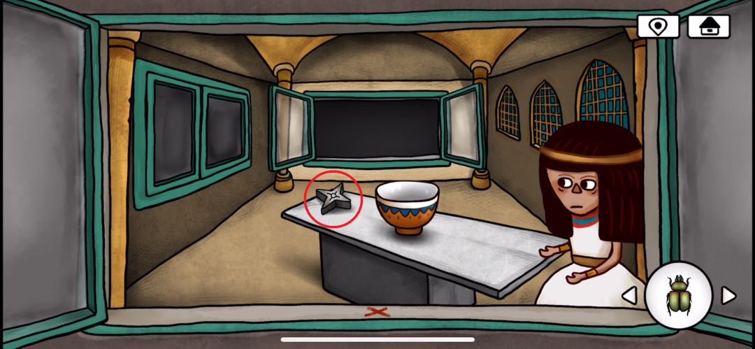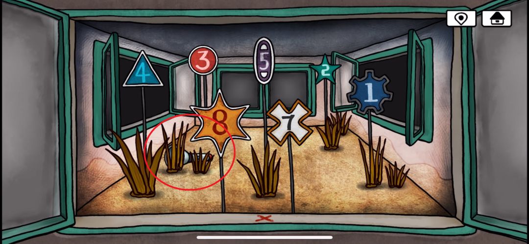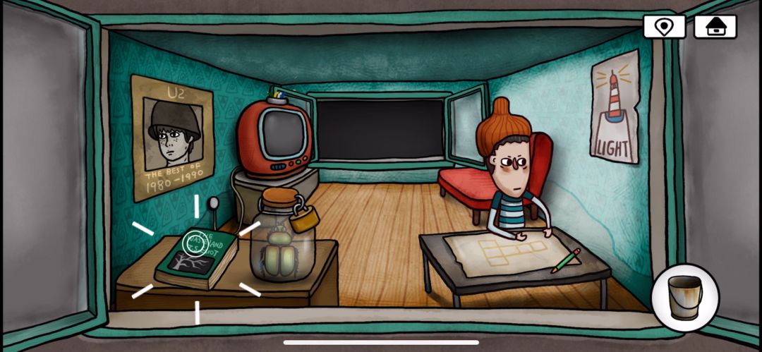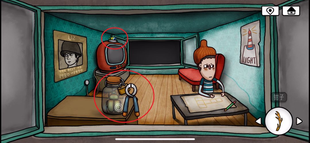 再次来到涂鸦小男孩的房间,用钳子打开玻璃罐,得到蜣螂,将天线按照到电视机上,电视内容提示挖出太阳符石的位置
