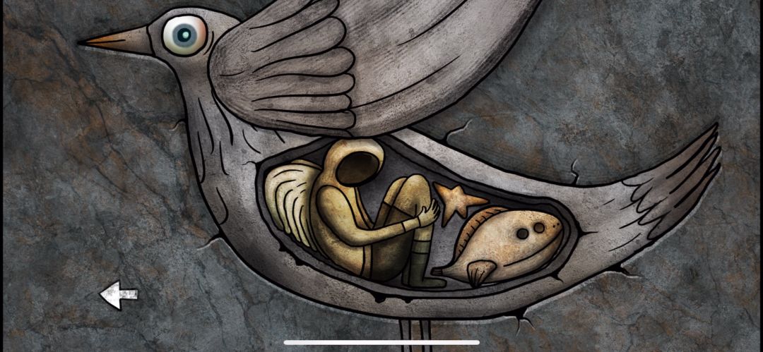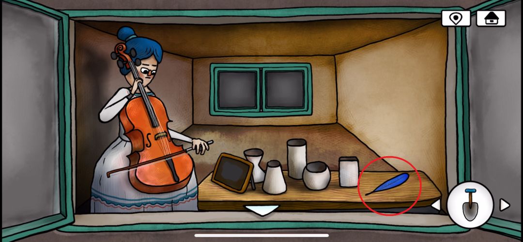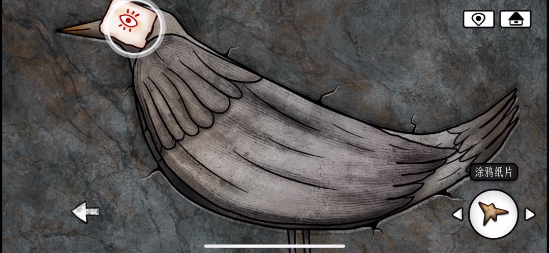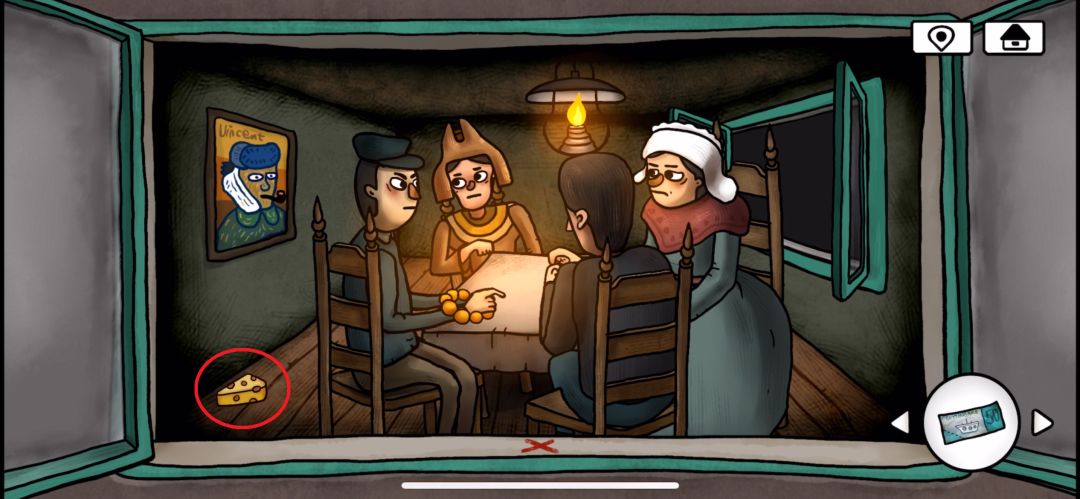 蹦出来一只小鸟,刚好挡住了切换房间的按键,进入左边房间,捡起地上的奶酪,喂给小鸟后可以来到小屋外面