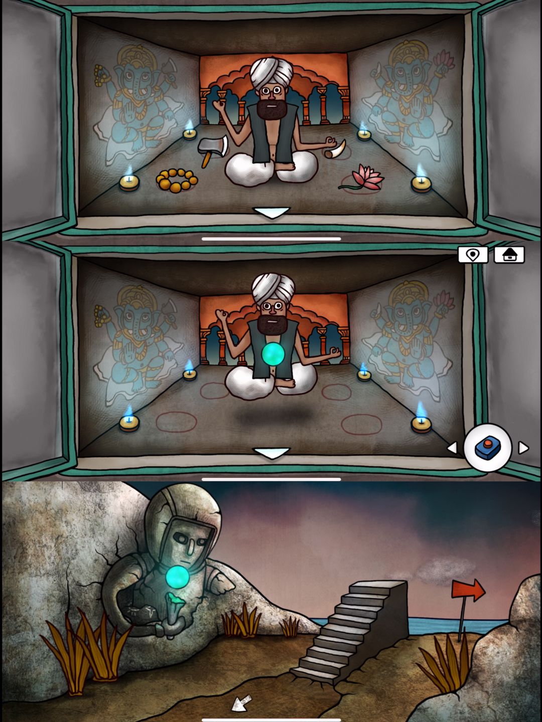 进入前面尽头的房间,将象牙,莲花,斧头,佛串按照墙上的提示摆放,得到的绿色能量球放在小屋右边的雕像手里