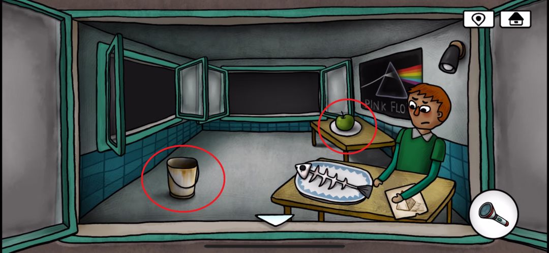 在想吃鱼的男人房间里,捡起地上的铁桶和苹果旁边的橄榄