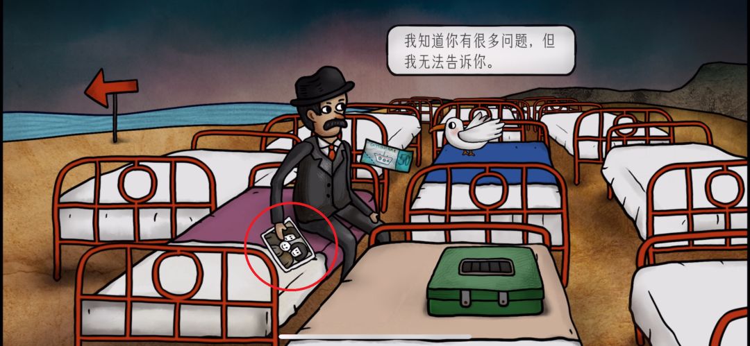 打开手提箱,拿走轮船照片,当开关手提箱到第18次时会出现一张时间纸条,第99次可以达成一个成就:光阴似箭,多次点击白色鸽子,可以达成成就:坚持不懈