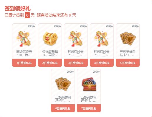签到第5天奖励:种族召唤券*10、三族英雄自选卡*1、12小时英雄经验*3