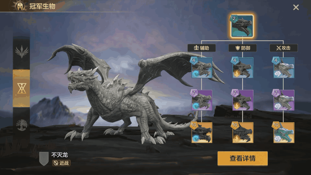 作为暮园阵营初始近战冠军生物,不灭龙拥有三种赋能进阶路线,其中影龙属于远程气绝艺攻击定位,和拥有气印记、气附着机制英雄完美契合,建议优先招募。