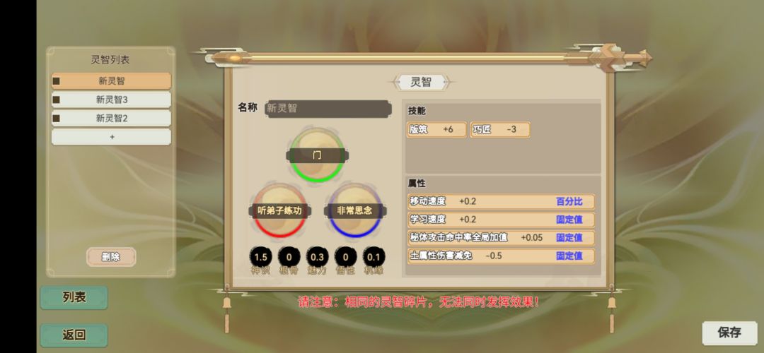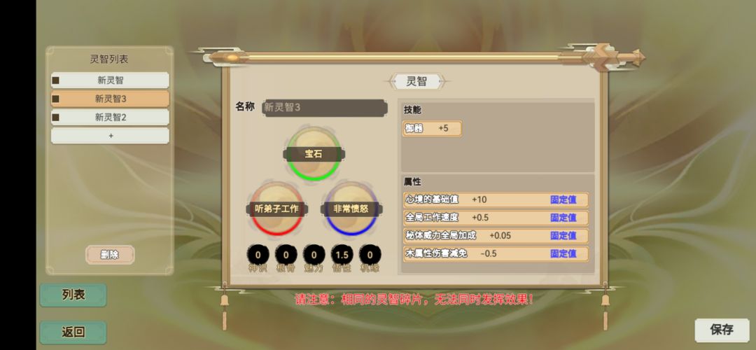第二步:选思绪,思绪这边必选,听弟子工作(加全部弟子工作,加全局工作效率50%),和被捕猎(加全部弟子速度的),妖族需要三组灵智才能保存,具体想要什么灵智,各位同学可以多尝试,图中我选的灵智是前期当外门,后期当体修大佬的。