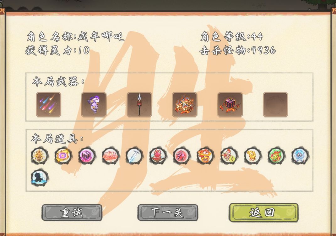 还有另外的一些小体验问题,是基于我个人的,首先我是手柄玩家,游戏中笔这个法宝,鼠标很方便,手柄就不知道怎么弄了,同样变身成龙玩贪吃蛇,手柄我也不大明白怎么操作的。这些偏主动的如果在手柄上实在不好搞,至少也搞个自动智能释放嘛。最后就是我不知道那可以看到当局明细情况,每种法宝效率咋样,自己选的法宝具体是什么效果,成长性法宝成长到哪一步了?在选完后都没法再次观看了。虽然我知道游戏是爽游,但我还是想看看怎么组合才效率高嘛。