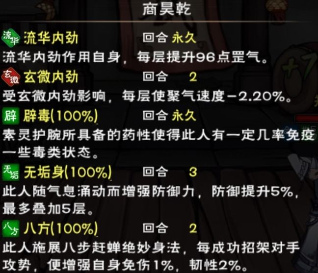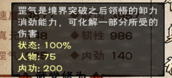 罡气:一种极为强大的防御属性,可以按数值1:1减少受到的攻击伤害,也可以减少敌人内劲debuff的影响(类似韧性)。
