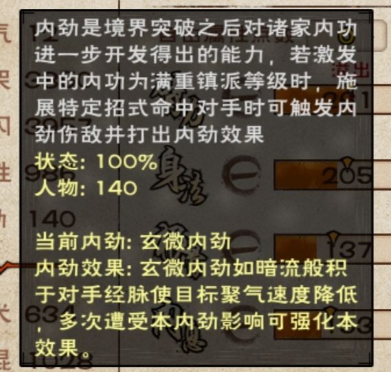 内劲效果受内劲的具体数值影响,增益减益都如此。比如当你120内劲时,易筋经的易筋正罡可以提升176点额外内劲;但你60内劲时,仅提升167点额外内劲。debuff的数值也是同理。