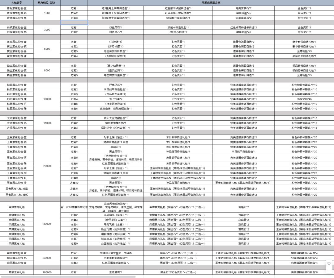 ①每周(上周一至周日)累充达到以上礼包奖励条件,在周二会邮件给予对应的礼包奖励(按达到条件的最高一档发放)