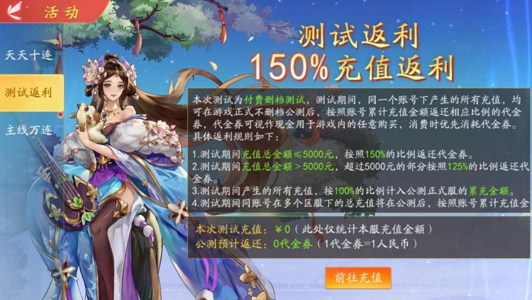 本次测试为付费删档测试,在测试期间产生的所有充值,将在游戏正式不删档公测后按照一定比例返还代金券。