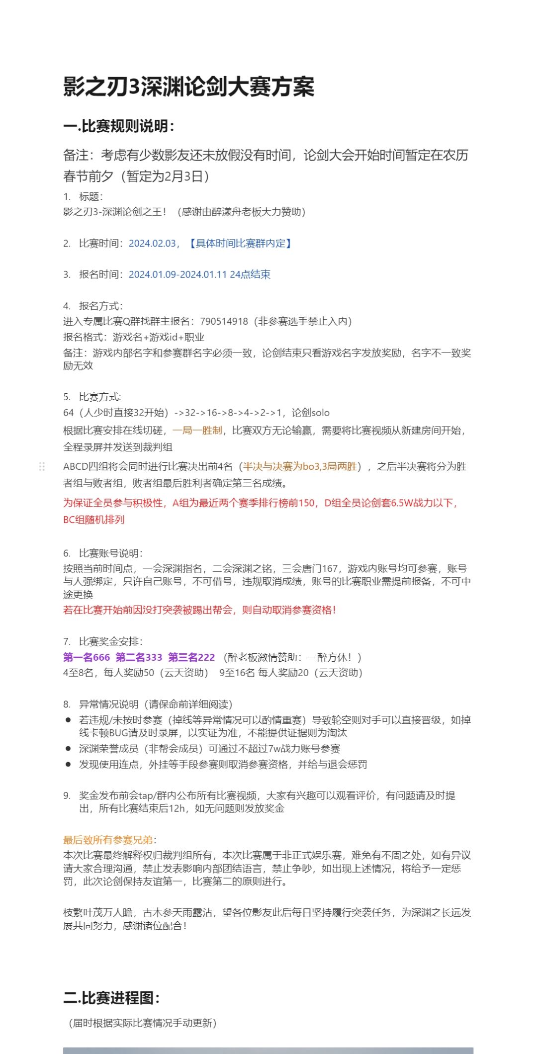 大家好,我是芸天,随着影之刃3即将迎来大版本更新换发生机,也正赶上新春即将到来,为奖励群员一年以来的辛苦努力,帮会内部举办了一场福利性质的娱乐比赛,比赛为会内1v1论剑赛,根据段位分组PK,准备了差不多2000的现金奖励,40余位参赛选手。接下来给大家介绍下比赛准备过程,其他想举办的帮会也可以参考下。希望大家共同创造开心积极的游戏环境!