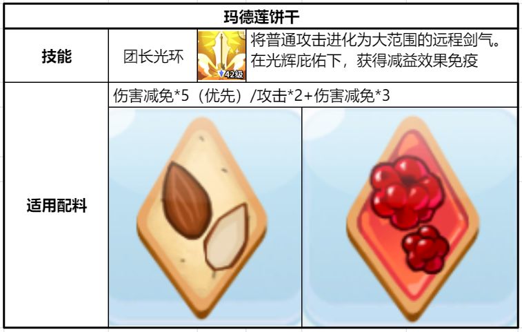 玛德莲饼干是输出向的防御型饼干,技能非常适合PVE快速推图,但同时也能打PVP。而且,玛德莲饼干因为释放技能时可以免控,所以,如果说其他防御型饼干在遇到带控的敌人时,自己会被封技能只能靠队友打伤害,那玛德莲饼干可以在技能期间无视控制继续提供输出支持。