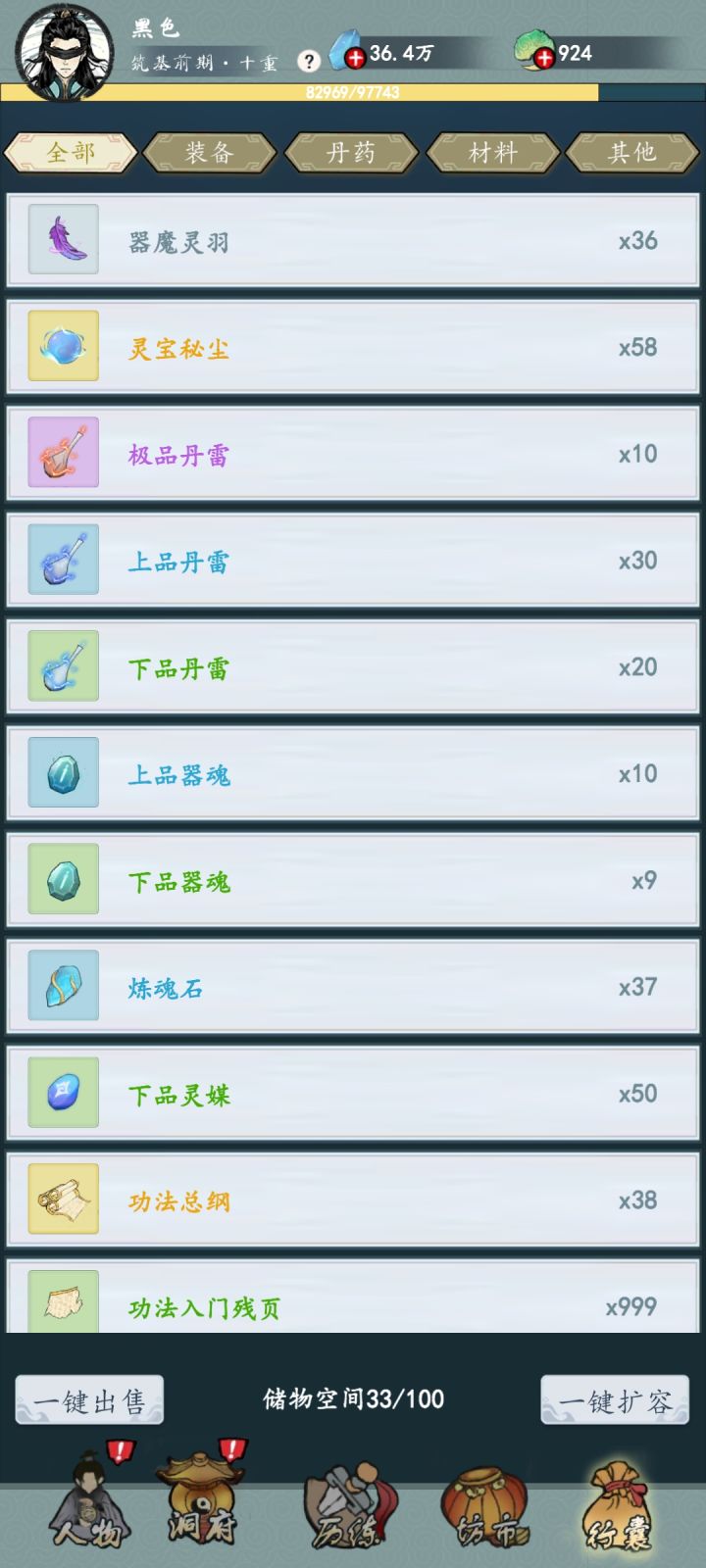 坊市:灵石商店一品的材料可以不买,挂机的材料够升到2级,所有图纸必买(买了就学)炼丹炼器到2级后再来刷新买2级材料做装备和丹药。