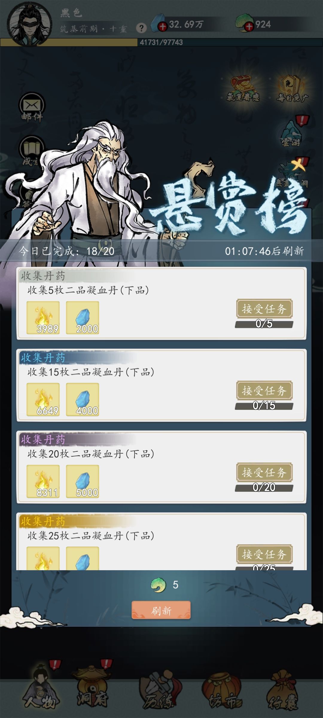 悬赏:筑基后再做,经验高很多,悬赏要求的下品丹药就是颜色是绿色的那个,包里有就能完成,没有要自己去练。