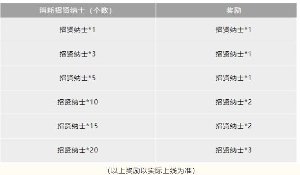 活动期间,累计消耗一定数值的「招贤纳士」将可以获得对应数量的「招贤纳士」。