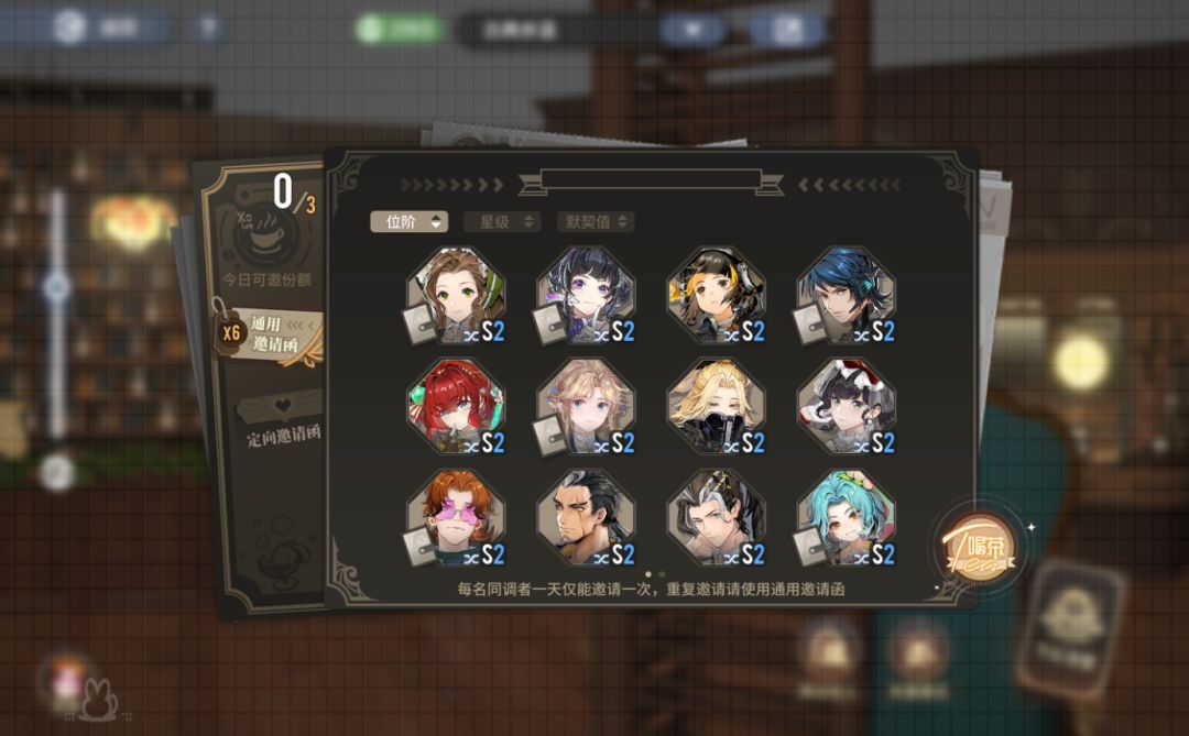 每天都可以请已有的同调者一起喝茶,一名同调者一天只能邀请一次,每天有三次免费邀请的机会,如果想要重复邀请某一位同调者,或者是在免费次数用完的情况下,就会消耗“通用邀请函”。这种邀请函我们可以在“友情勋章”商店等地方兑换。