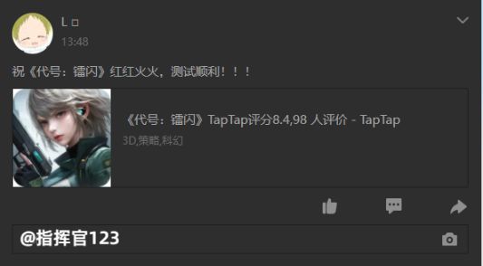 《代号:镭闪》TapTap独家不计费删档测试定档1月16日10:00,各位指挥官,快来邀请好友一起参与测试招募吧,现在分享本帖至微信/朋友圈/QQ/QQ空间/微博(任选其一),在评论区晒出截图还将有机会获得京东卡奖励哦🎁,共有十个获奖名额!