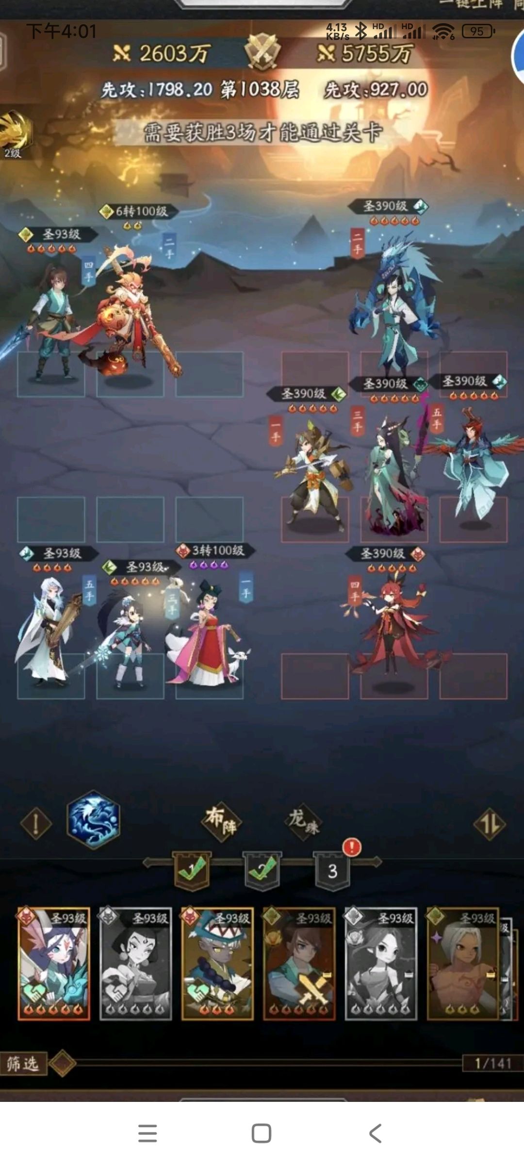 1044这关,3个武圣2个剑灵,又肉闪避又高,炸塔因为牛魔王分摊伤害的机制,也炸不死怪,所以选用的是广寒冰冻真伤流,利用群攻控制以及小吹频繁反击触发控制,来打出真伤,实现通关