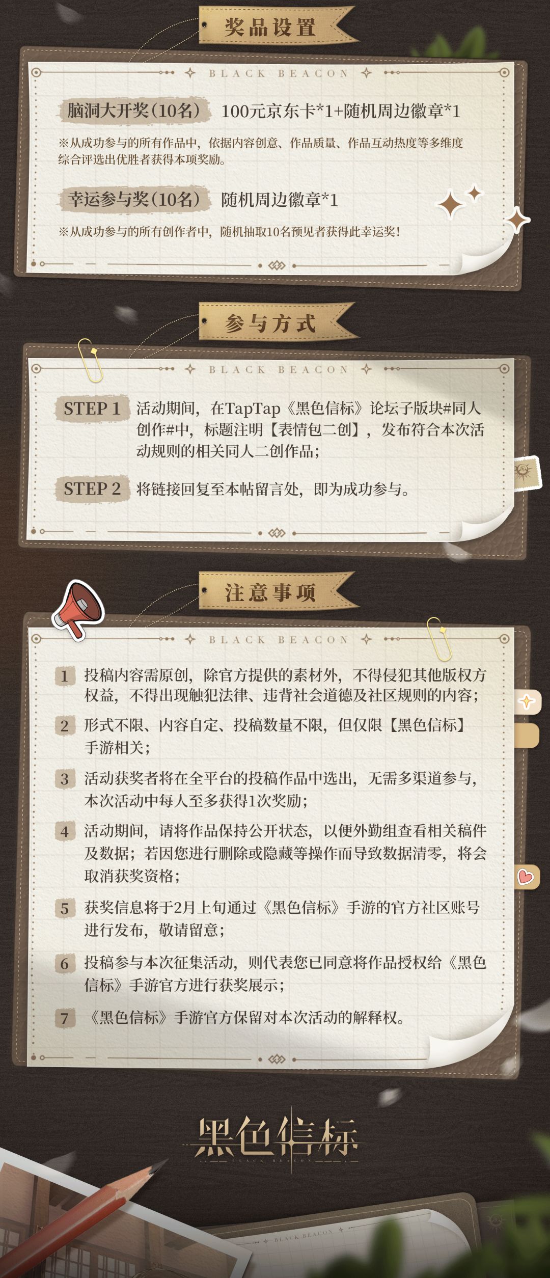 STEP 1:活动期间,在TapTap《黑色信标》论坛子版块#同人创作#中,标题注明【表情包二创】,发布符合本次活动规则的相关同人二创作品;