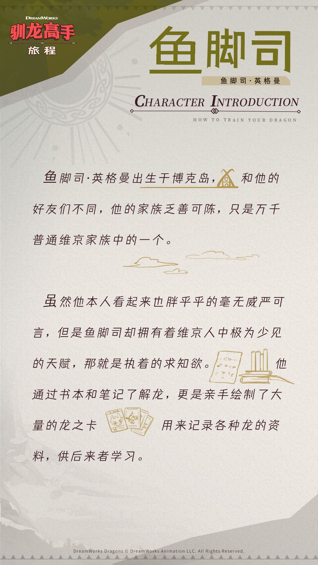 《驯龙高手:旅程》是由环球影业和梦工场动画授权,明日世界自研并发行的一款模拟经营育龙手游。故事发生在维京时代,你将在游戏中扮演驯龙学院的龙骑手,招募、驯服、繁育培养各具特色的飞龙伙伴,组建强大的驯龙小队,与他们一起称霸“天空竞技赛”,保护“博克岛”,成为真正的“驯龙高手”!