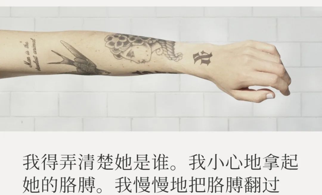 「她有几处纹身,有一些符号和一个数字......」