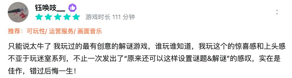 整个游戏全流程8小时左右,单机无联网,适合在茶余饭后火车上打开,和朋友一起解谜双倍快乐。