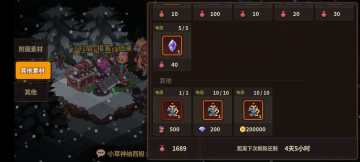 萌新玩家注意在339层后拟态怪就会刷新每周21个装备盲盒,还有注意43级及以上等级装备改造一律300钢,而42级只改造需要65钢,所以个人建议在347层打造3套好奇探险家。