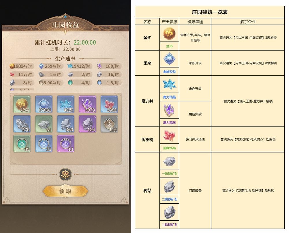 庄园会源源不断地为祖宗大人产出金币、魔力水晶、魔力精粹等资源,它们的产出速率则取决于庄园设施(如魔力井、金矿、铁匠铺、传承树等)的等级。