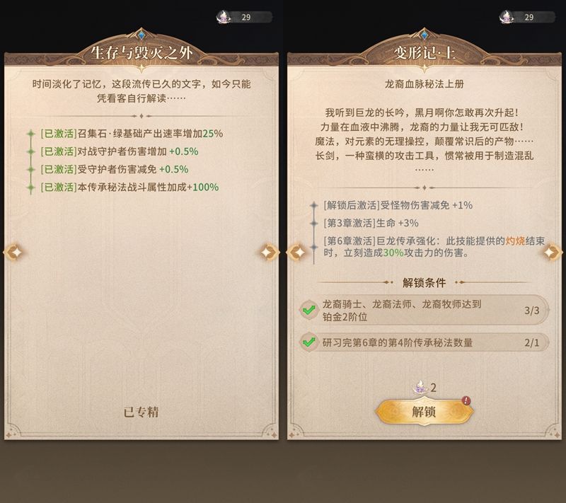 这些传承秘法有着各种各样的效果,有的可以增强庄园设施的产出速度,有的则可以强化特定职业、血脉成员的技能。