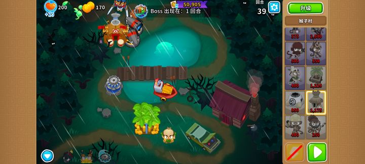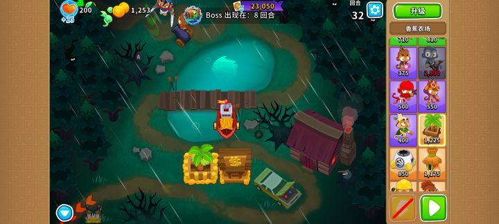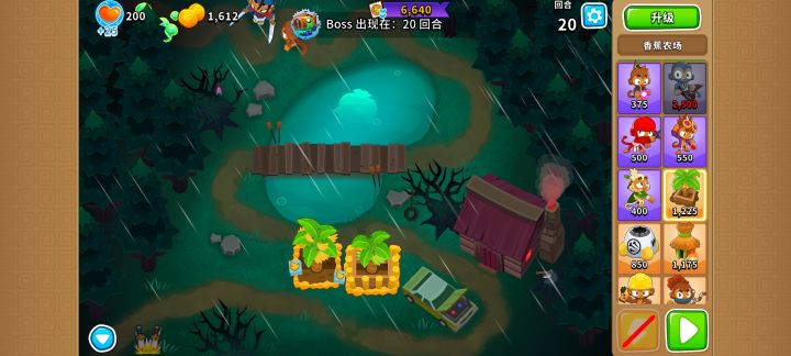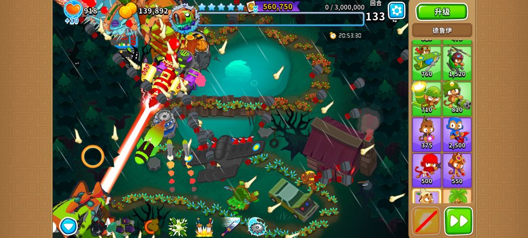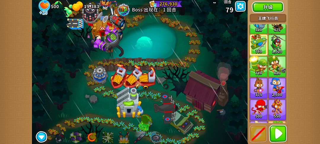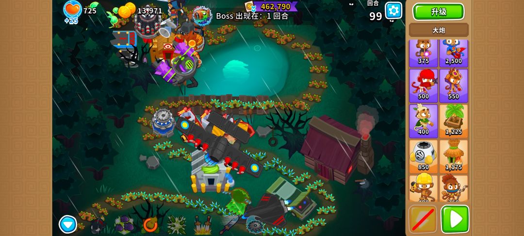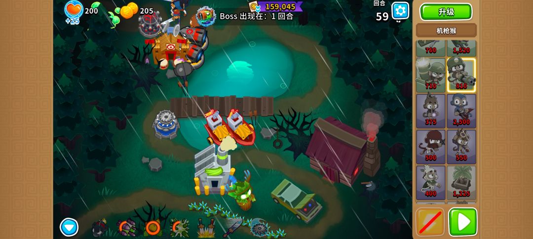 打完后接着农,摆三个004海盗,一个420农场,两个320农场,到60波时,如图四出150德鲁伊,204钉刺塔,240机枪,手操机枪,大炮技能有了就开。打完boss挂机到80波。