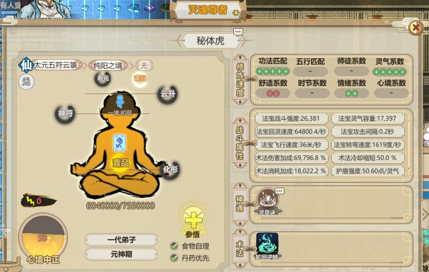 这一套下来拥有50.60的护盾,由于这个小人的本命符顺序有些问题护盾比攻略描述的要低。万妖宫的内门攻击机制是优先攻击法宝,法宝目标丢失后才会攻击本体。武昌符对炼体小人的克制极大,能大幅降低炼体小人的命中和闪避,灵气消耗过多优先使用回春术和轮回逆转,两个法术使用完后灵气依旧不够就吃玄平珠,玄平珠是最后吃的保命哟。