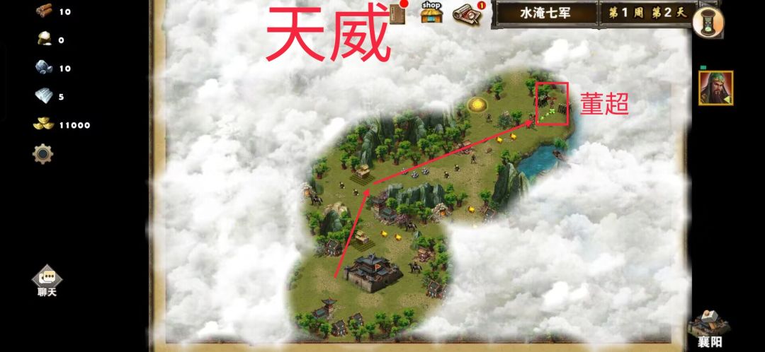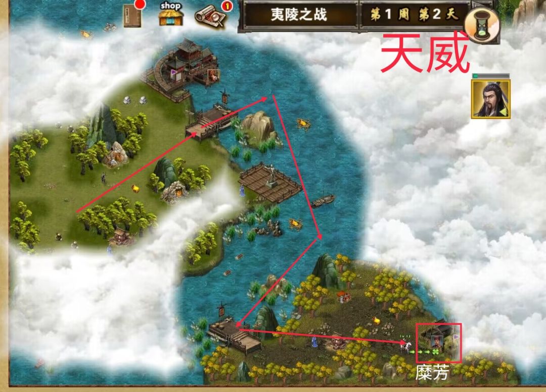 打法思路:开局直接去打堵口武将(如果现场有擂鼓可以退出重新开局刷一个没有战鼓的开局会轻松一点),解决完堵口武将往下走糜芳就在下方岛屿的山寨里。(刘备换上九天惊雷仗月神甲和万灵头打消耗)