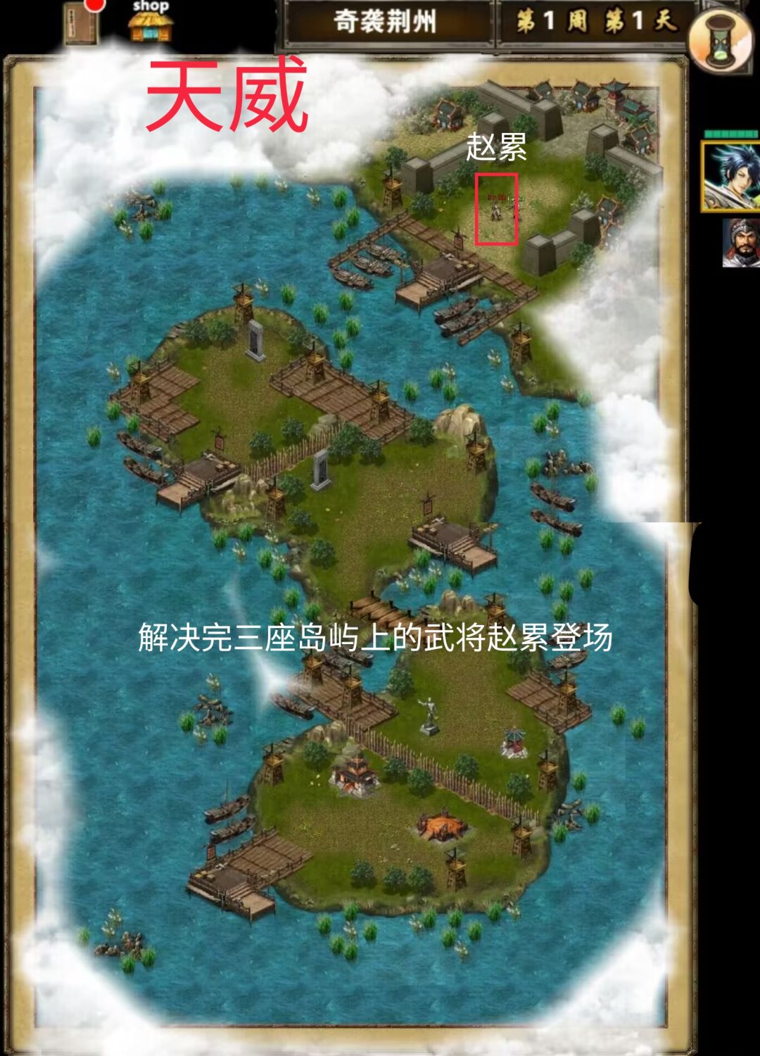 打法思路:击败三座岛屿上的武将以后,赵累会在右上角登场。