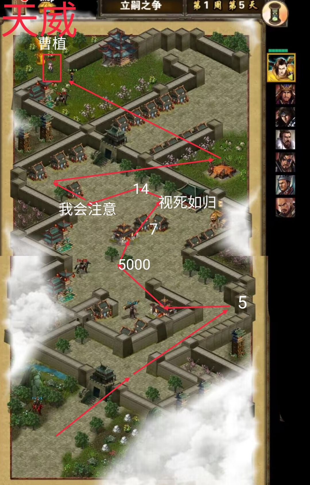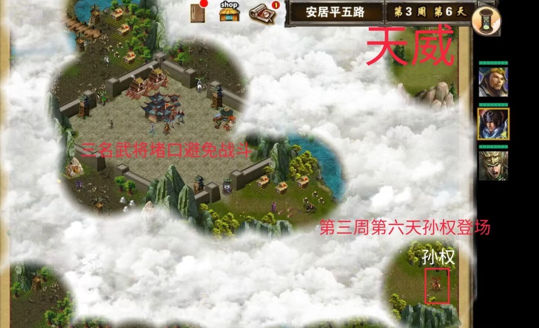 打法思路:开局三名武将分别堵住三个城墙口(中途有其他武将会从另一个城门口来过派一个武将去堵住,或者三个武将直接把阿斗堵住)然后待机到第三周第六天孙权会登场。
