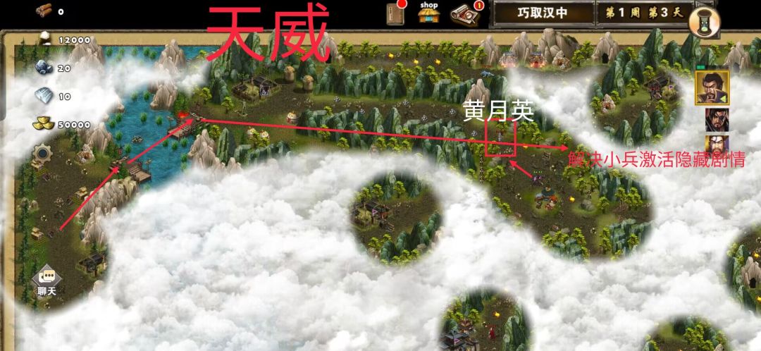 打法思路:开局曹操和夏侯惇许褚对话带上他们以后我们去对岸往中间市场位置跑,然后打掉堵口的小兵激活隐藏剧情,黄月英登场。