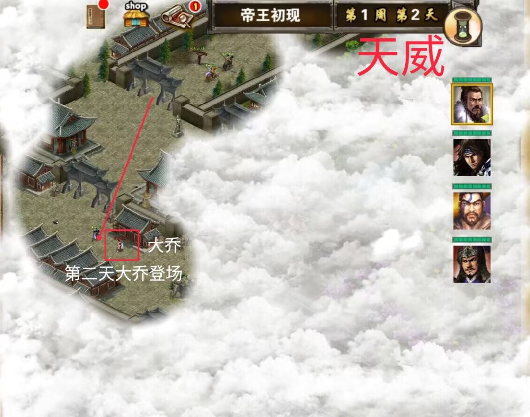 打法思路:开局待机一天第二天孙尚香登场,只能用大乔击败她。