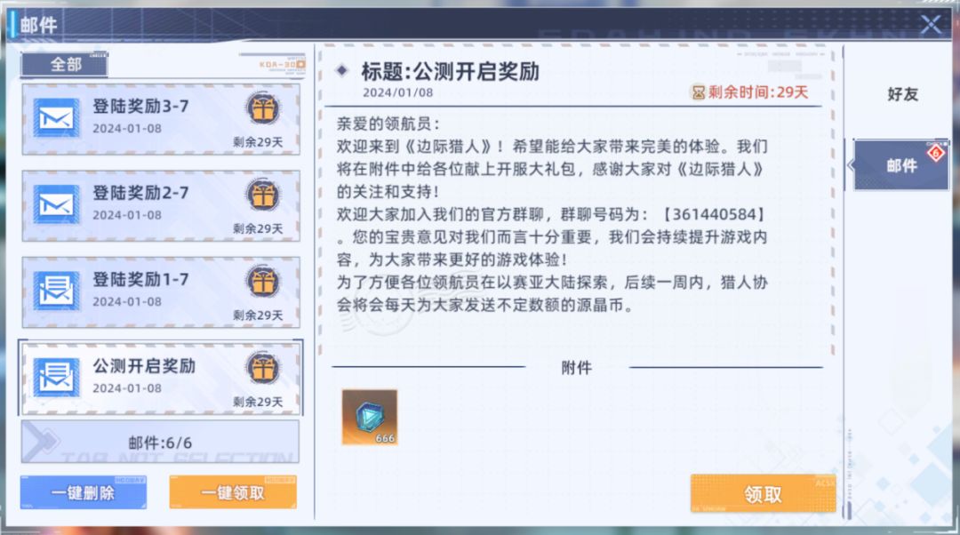 首先,领航员们可以进入邮箱康康哦~里面可是有大大们给领航员们精心准备的公测开启奖励以及登录奖励,登录奖励总共有七天的哦!可不要忘记啦!(超大声)